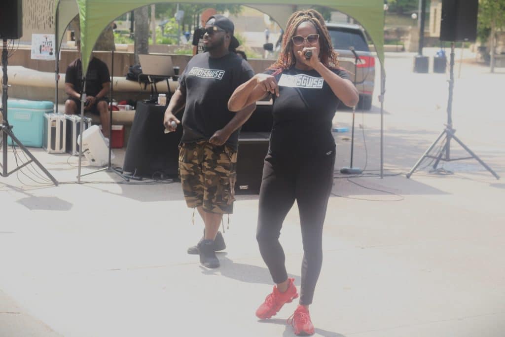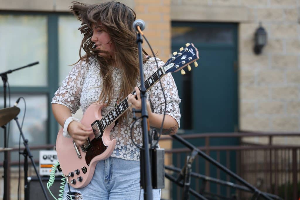Lunar Moth perform on the WORT stage at the Willy Street Fair. There's a pale-brick building in the background. To the right of the image, guitarist/vocalist Amber Fasula is playing guitar and smiling while singing into a microphone. She's wearing a sheer white lace flower print shirt and a frayed denim skirt. Behind her to the left of the image, Mac Felckowski sets up a microphone at his drumset. He's wearing a striped button-up shirt and a cowboy hat.