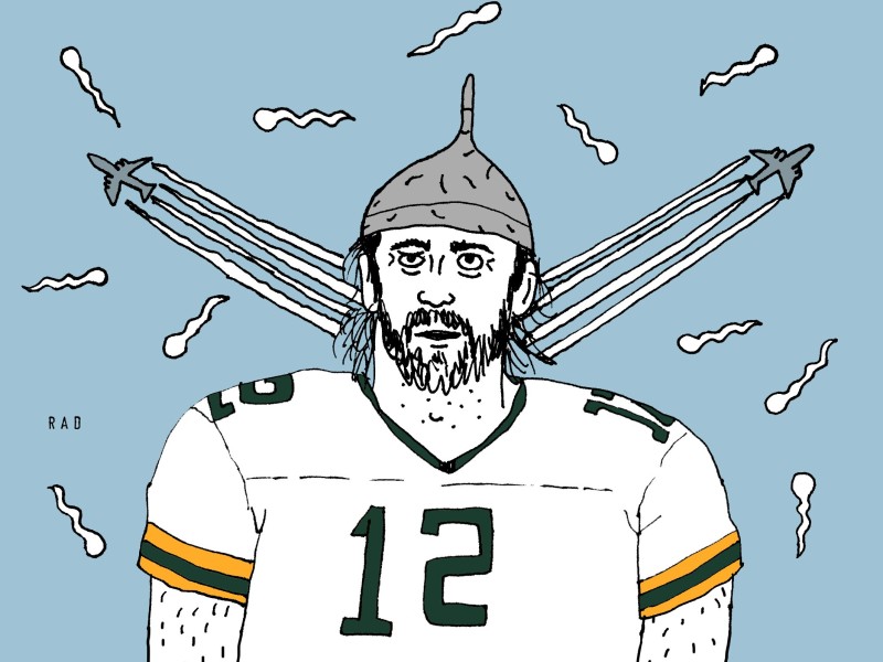 Illustration: Aaron Rodgers is depicted wearing a tinfoil hat, surrounded by airplane chemtrails and sperm. Illustration by Rachal Duggan.