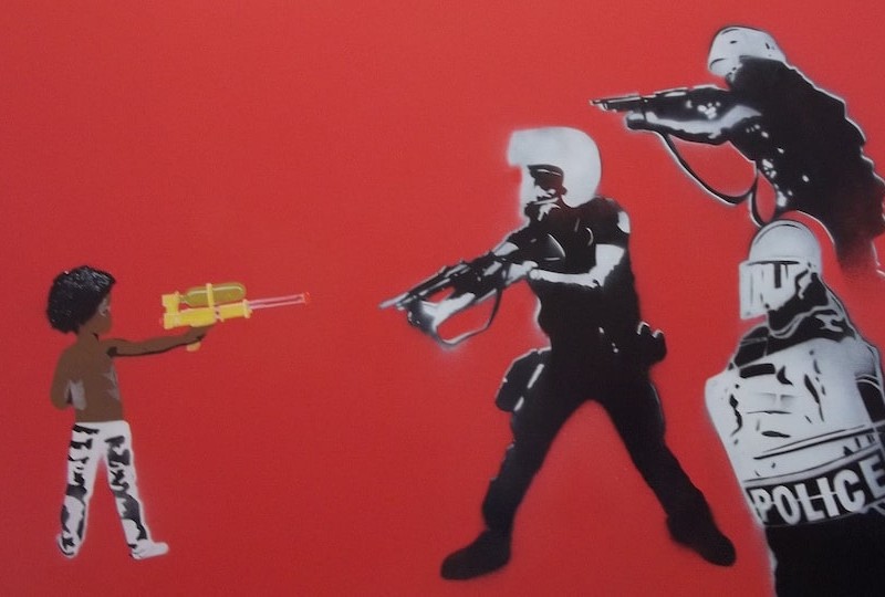 Quite large in size, “Don’t Shoot” was created with acrylic and spray paint on canvas. Built upon a bold cardinal background that’s somewhere between the color of fresh blood and Badger red, it features a trio of police officers decked out in riot gear, two of whom are wielding what look like tactical shotguns and the other a plastic shield, all facing towards a young African American child who is pointing a Super Soaker-style water gun. The cops are presented in a Banksy-style black-and-white stencil form, while the kid is painted in color.