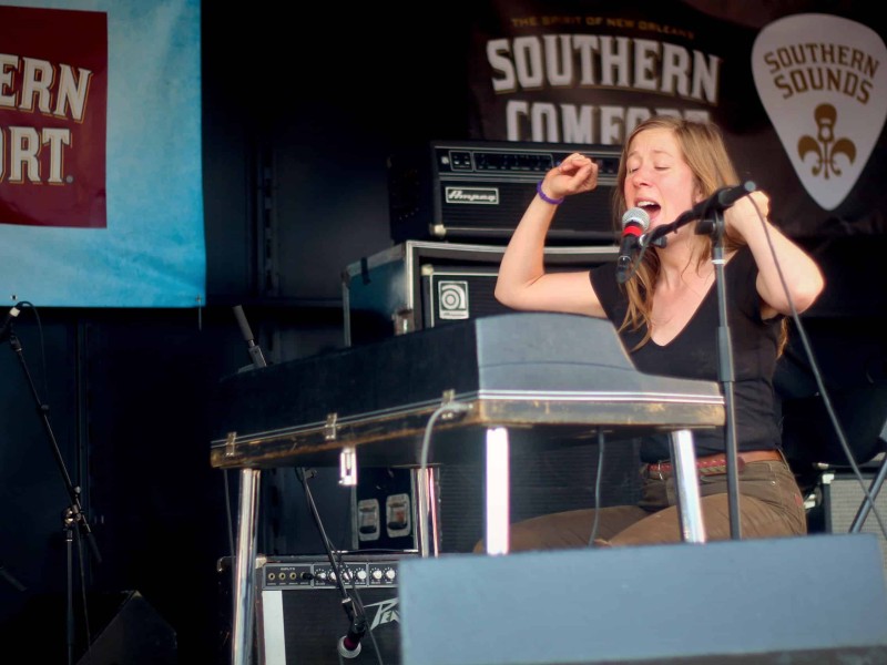Photo: Julia Blair performs on a sunny outdoor stage during the 2017 edition of Mile of Music in Appleton, WI. Blair’s shown sitting behind a keyboard to the right of the image, eyes closed, hands raised in the air, mid-vocalization. There’s a purple wristband on her right wrist and she’s wearing a black V-neck t-shirt and dark tan pants. Behind her are several promotional banners for Southern Comfort. Photo by Steven Spoerl.