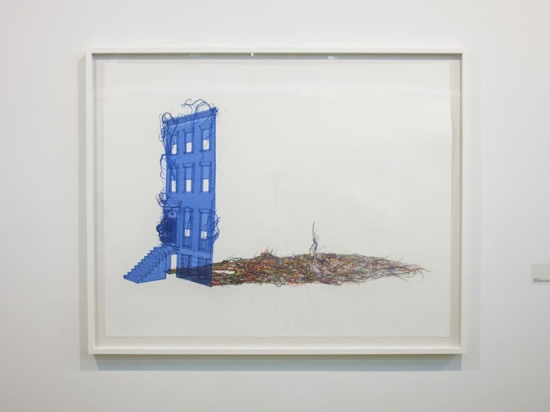 The best part about seeing Suh speak in person in February and having the opportunity to view a full exhibition, which included not only the fabric sculptures but drawings, too, was realizing how much good humor goes into creating this work. At his lecture, Suh spoke about how recreating one’s home out of fabric means you never have to feel homesick, because, “like a snail,” you can fold up your home and carry it on your back. There are certainly pieces he’s done in the past that have been whimsical, like “Fallen Star,” but the architectural precision of the exhibit’s centerpiece could reasonably lead viewers to overlook the more amusing and endearing elements. This comes out for me most in the drawings, like “Blueprint.” I saw these drawings as self-portraits of the artist as he searches for his home, whether by creating it out of his imagination, attempting to transport his entire house with him snail style, or in some cases just feeling aimless and homesick: feeling, in other words, like a “Fart In The Wind,” the title of another thread drawing in this show.