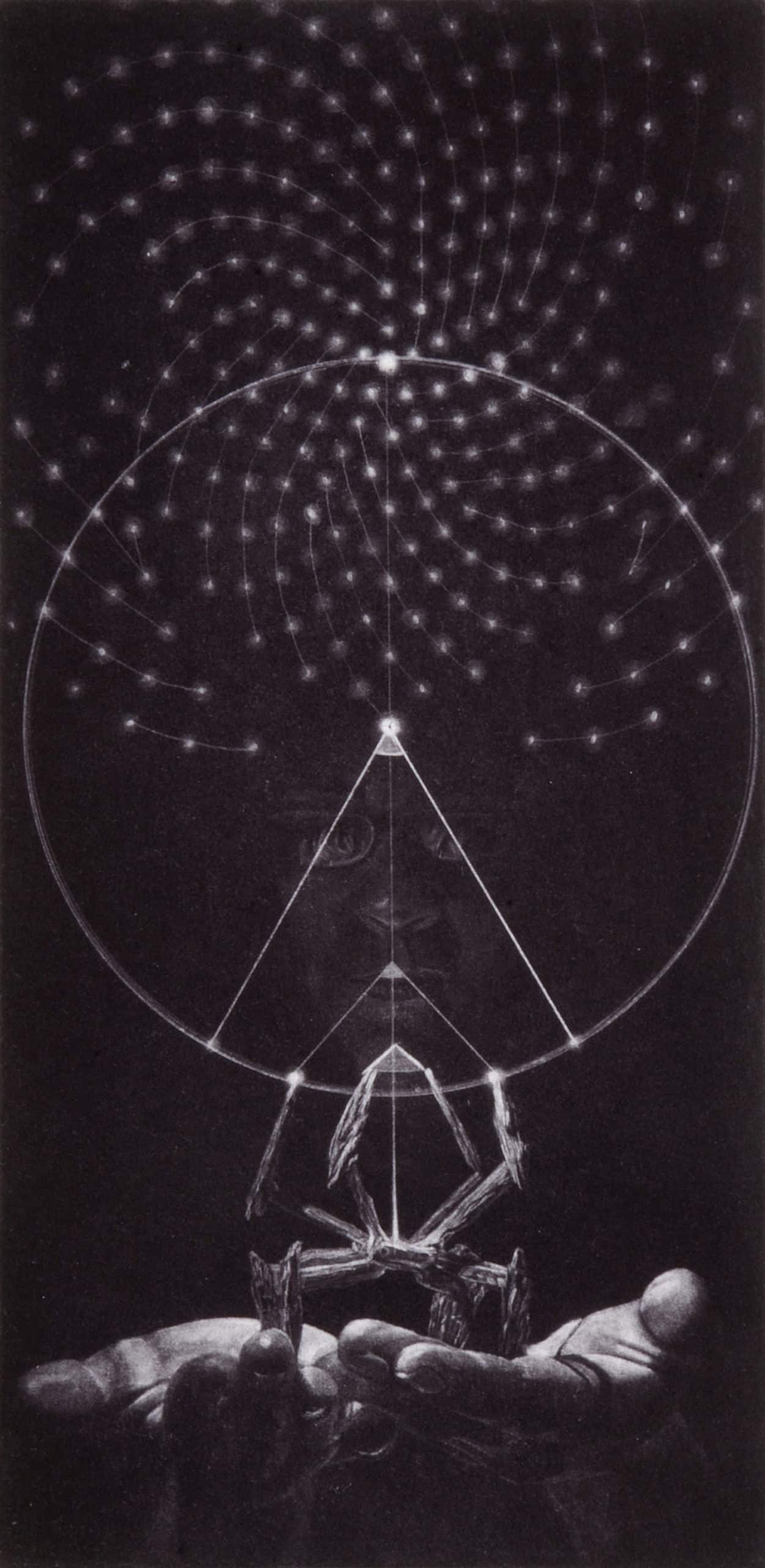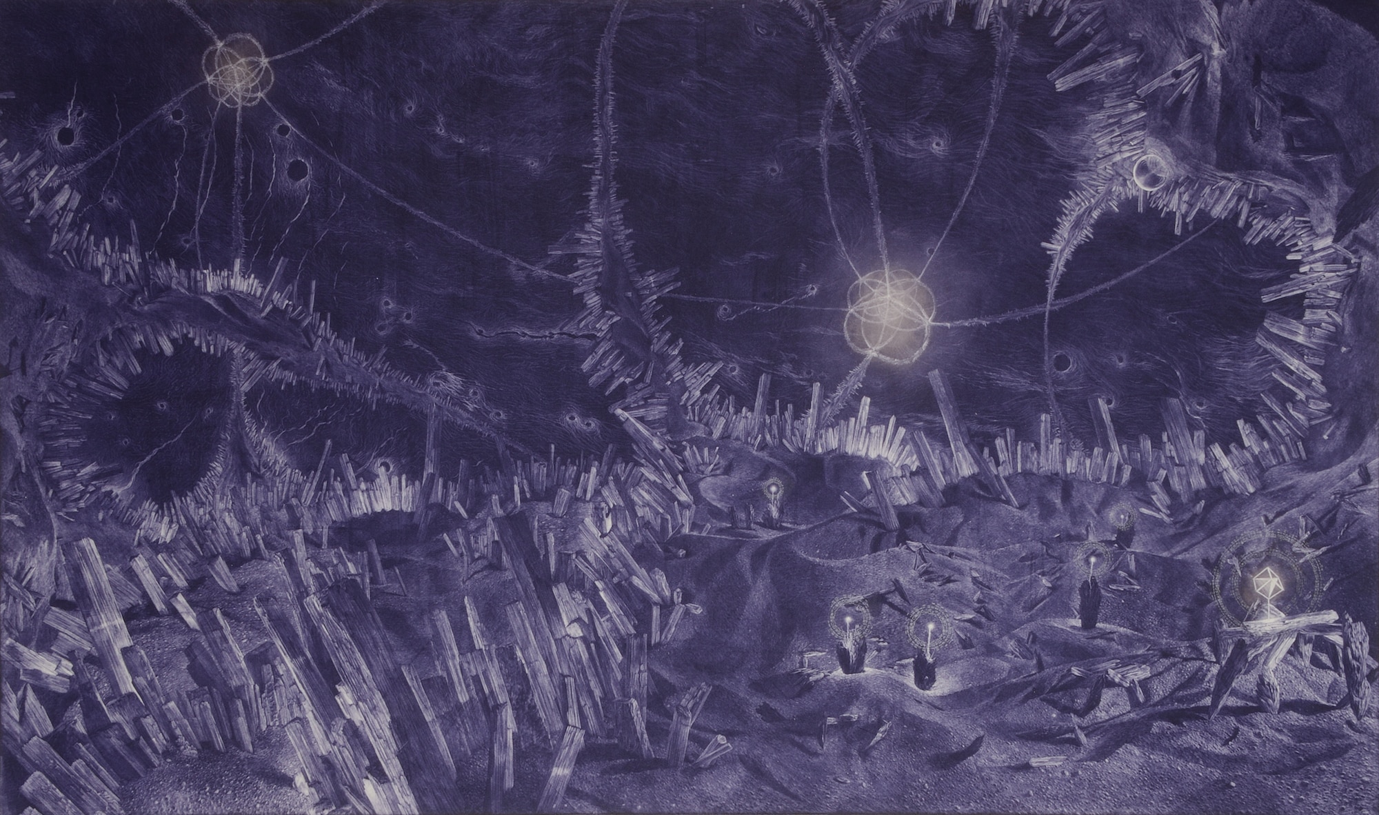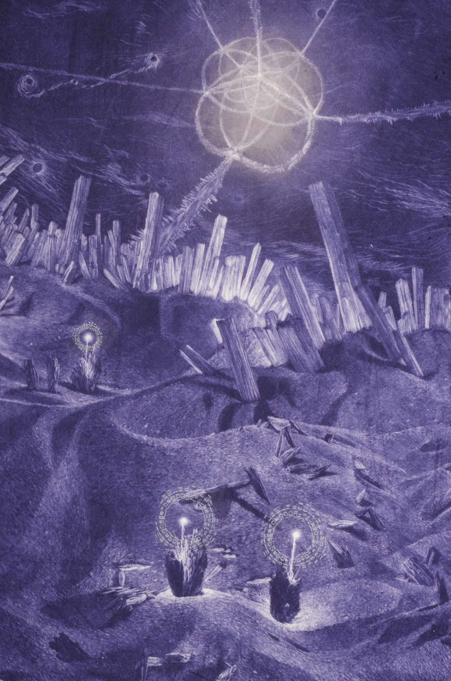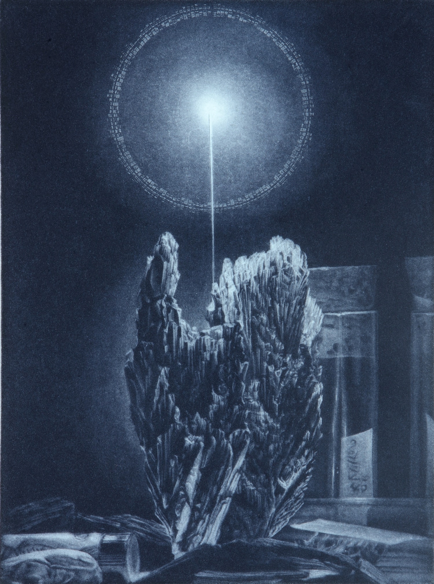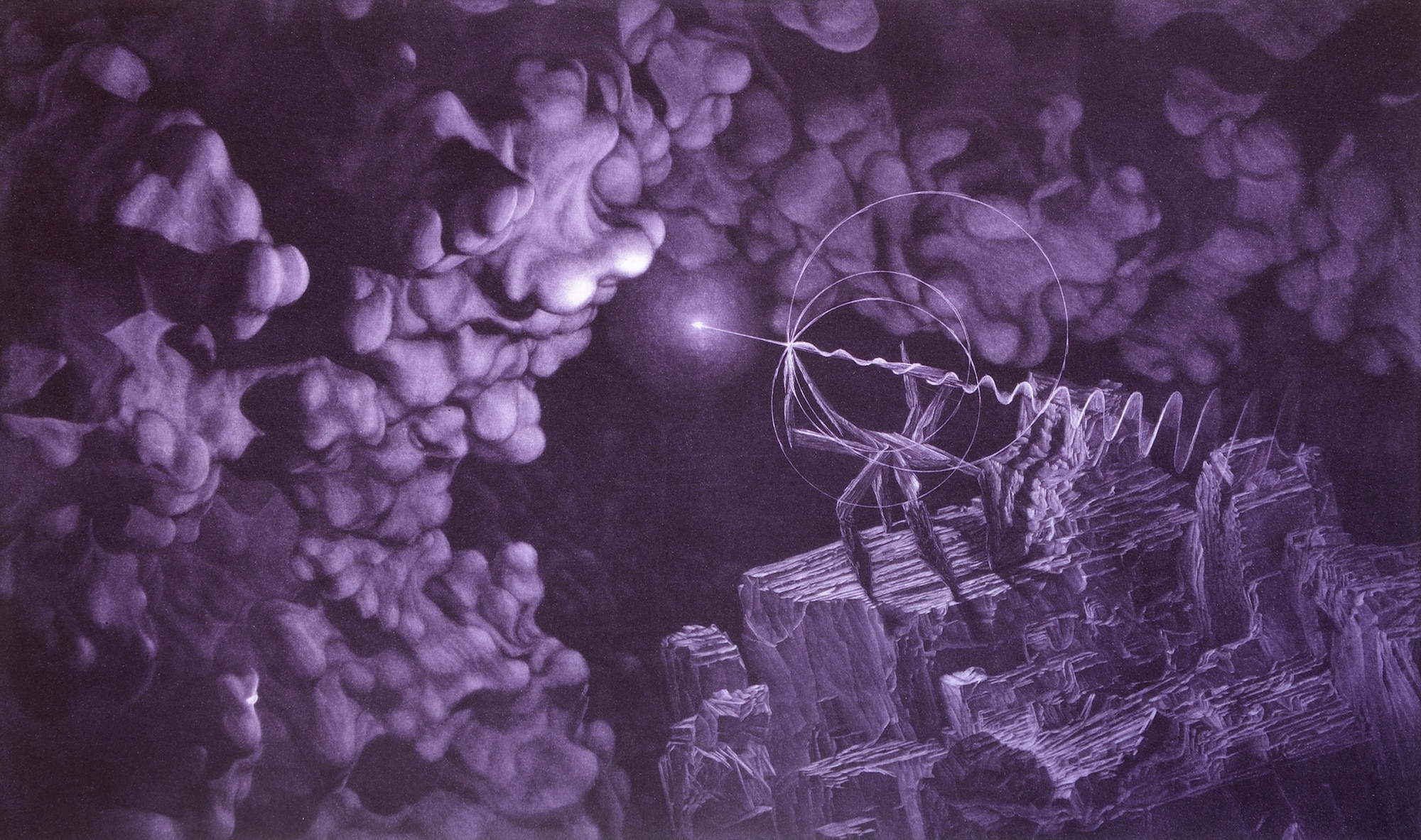 But Madison-based artist Douglas Bosley‘s show Unexplored Map, on display through August 27 at the Watrous Gallery, bucks that convention. There’s a generous dose of sci-fi world-building running through this collection of large-scale mezzotints. The show celebrates the invention of so-called “X-Ray crystallography,” a process that was developed in some future or alternate history which uses X-rays to determine the atomic structure of a crystal. This process is one that is tied to and undertaken by Auxons—a fictional creation Bosley describes as “a self-replicating system of robots that reproduces exponentially until it reaches a critical threshold.” From there, with each print and accompanying written materials, Bosley develops the nebulous narrative of the Auxons and offers a view into the world they inhabit.