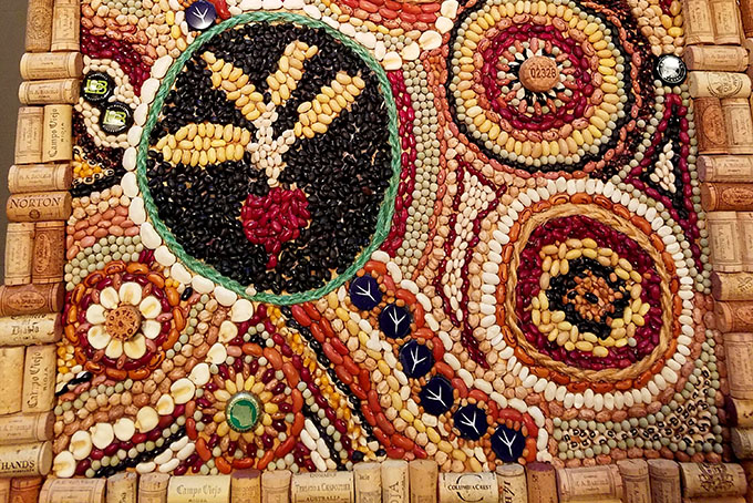 Baraboo artist Beth Persche took the theme of fermentation more literally, by creating a mosaic archway using beans, corn, wine corks, and bottle caps. The mosaic, inspired by tilework seen in Mexican churches, was a collaborative art project: About 200 Sauk County residents from four different communities helped Persche construct it.