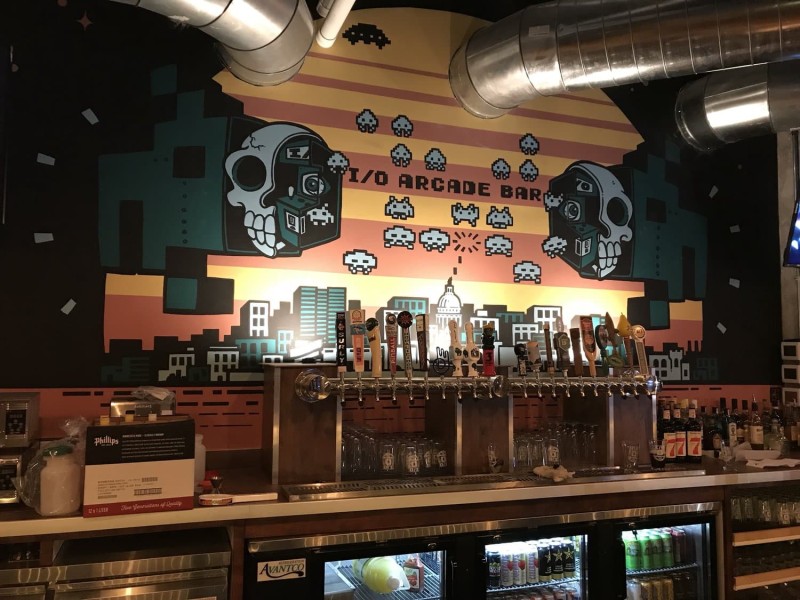 This past Thursday, November 8, Madison welcomed a new arcade bar, I/O Arcade Bar, which opened at 720 Williamson Street. The new establishment is tucked into a newly refurbished warehouse space and maintains a bit of that utilitarian charm, albeit with splashes of color like a massive mural behind the bar depicting the Capitol blasting space invaders over Madison.