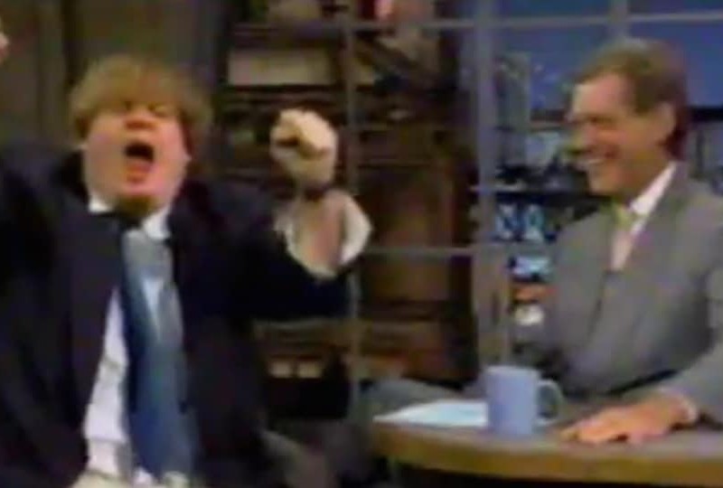 Taking his guest’s childlike fawning in stride, Dave assumes a fatherly role, chiding Chris for not buttoning down his collar. Whether consciously or not, Letterman would play this role on every one of Farley’s subsequent visits to The Sullivan Theater, going so far as to wipe chocolate from a prop Academy Award off his face and even kiss him on the cheek a couple of years later.