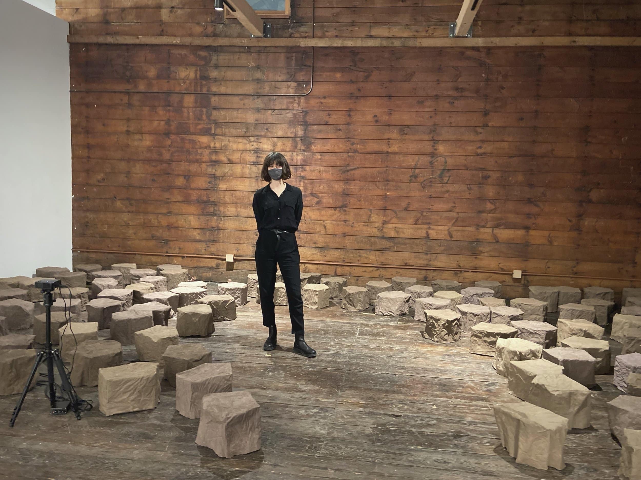 Photo: Helen Hawley stands among the lake sediment installations in the gallery.