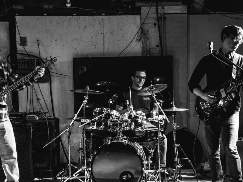 What resulted is a writing process in which Lamore contributes most of the actual riffs, but the whole trio works together democratically to figure out how they’ll fit together. Baker, Prochaska, and Lamore have played together in various other projects for about 10 years, and that probably explains the rhythmic flexibility at work on Hex House. (All three were in The Ferns, and members’ past and present projects include Madison bands Drug Spider, Gentle Brontosaurus, Caryatids, and TL;DR.) Prochaska can steer the band through a lot of shifts in feel and tempo, even within one song, and Baker’s playing has a warm and bend-y touch, refreshingly free of the rigidity one often hears in post-punk bassists. Lamore often loops his guitar, mostly to add some dimension and atmosphere to the trio’s sound, but sometimes to establish a repeating phrase. The loops are never really the core of a Hex House song, but they’re important enough to keep the members on their toes, timing-wise.