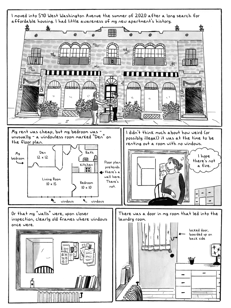 Panel 1: I moved into 540 West Washington Avenue, the summer of 2020 after a long search for affordable housing. I had little awareness of my new apartment’s history.
