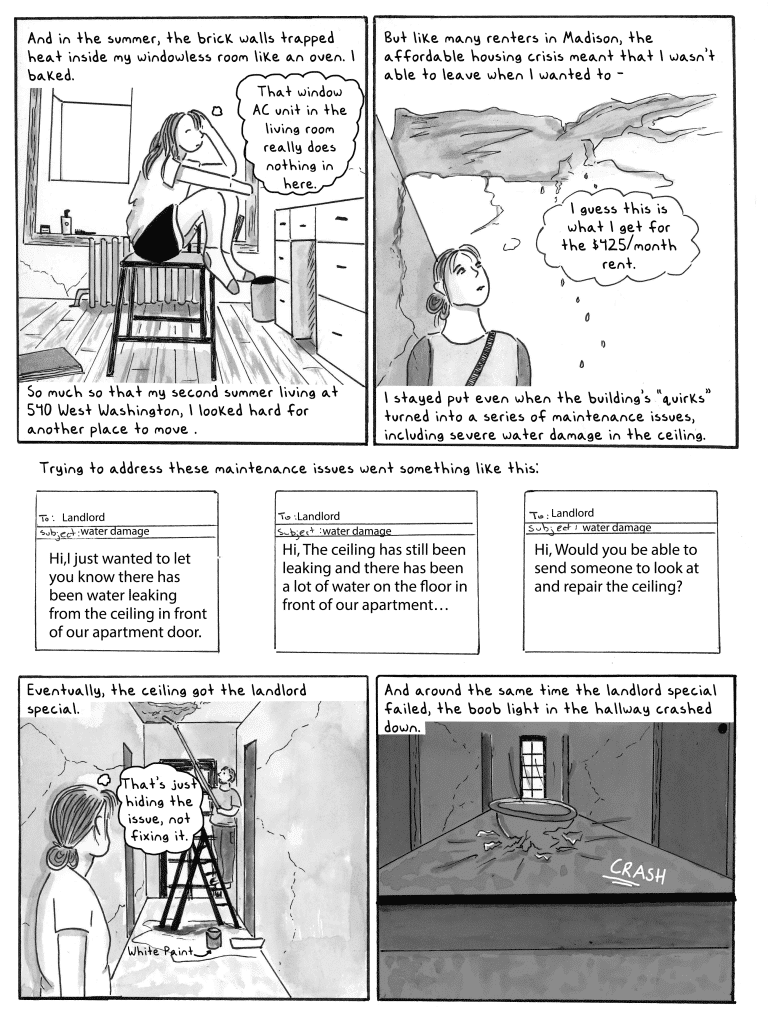 Panel 7: But like many renters in Madison, the affordable housing crisis meant that I wasn’t able to leave when I wanted to –