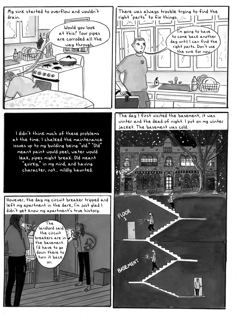 Panel 13: (narration text only) I didn’t think much of these problems at the time. I chalked the maintenance issues up to my building being “old.” “Old” meant paint would peel, water would leak, pipes might break. Old meant “quirky,” in my mind, and having character, not… mildly haunted.