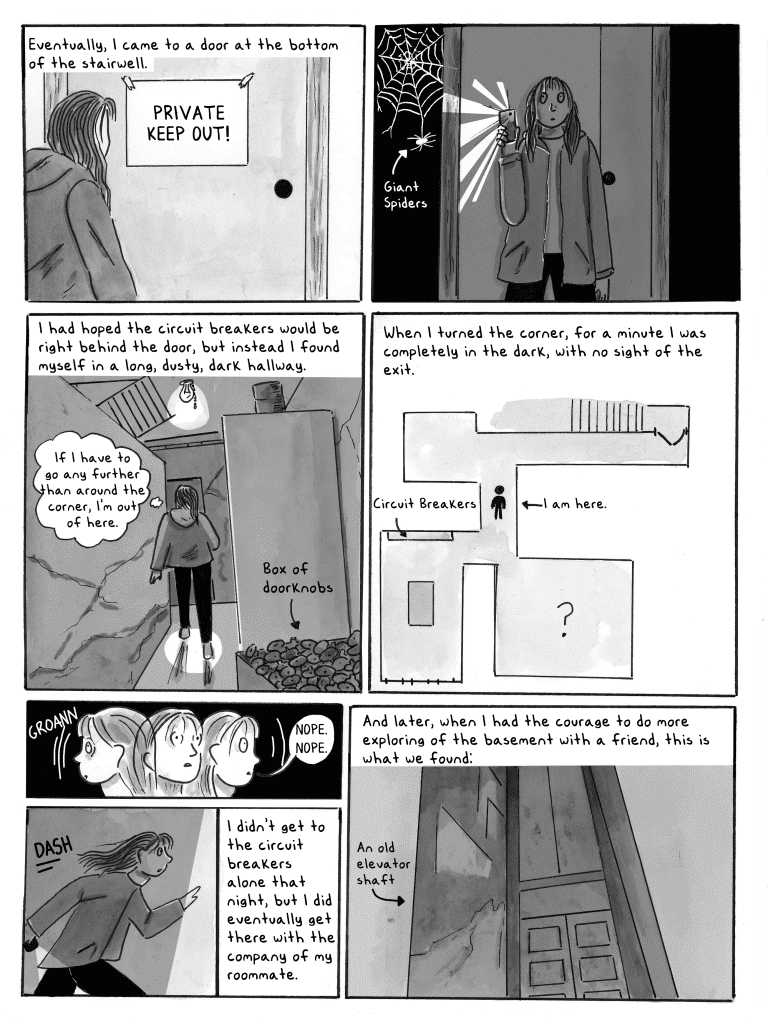 Panel 14: However, the day my circuit breaker tripped and left my apartment in the dark, I’m just glad I didn’t yet know my apartment’s true history.