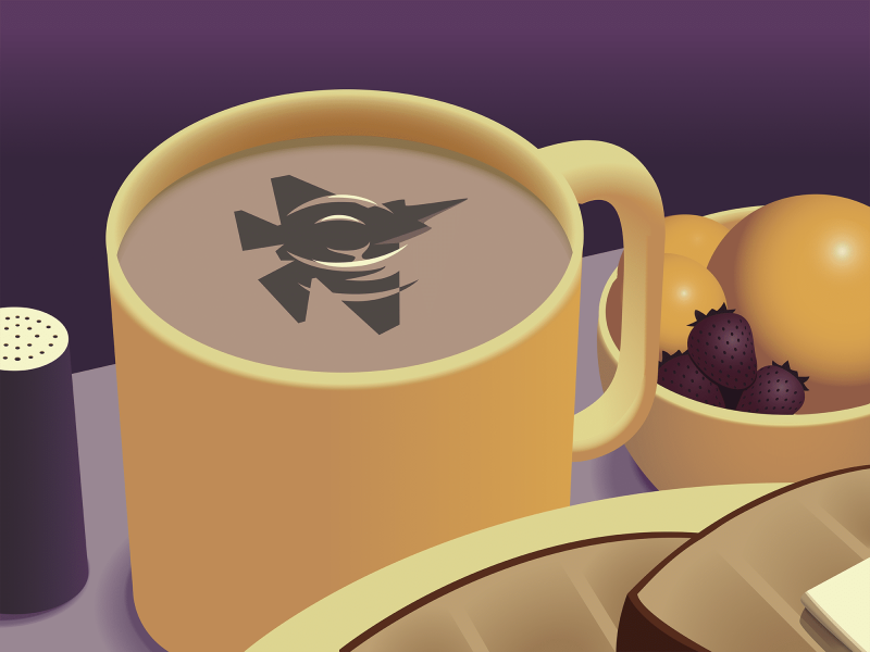 Illustration by Andrew Mulhearn. An F-35 fighter jet flying overhead is reflected in a yellow coffee mug, which sits on a pale purple table against a deep purple background.