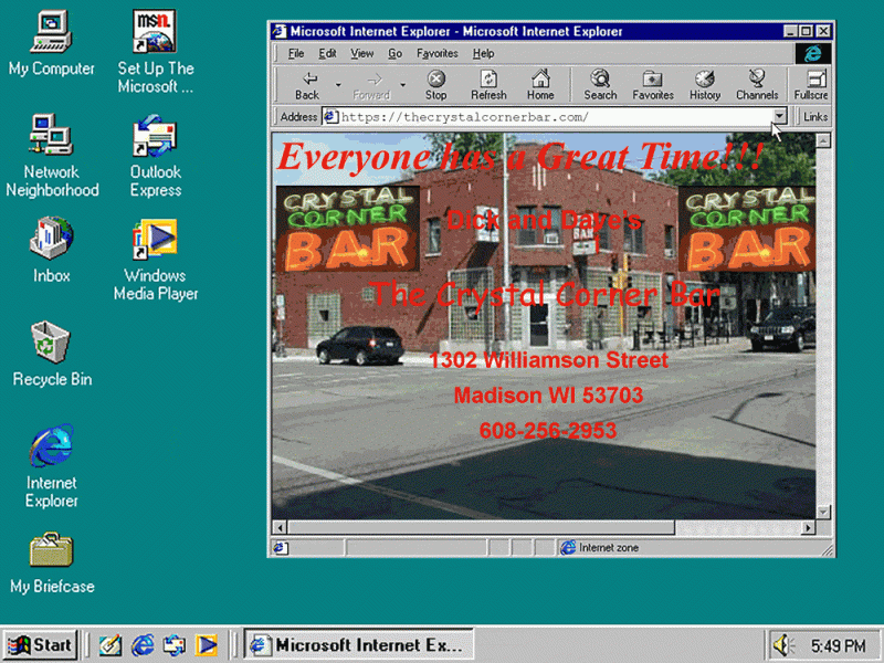 It hits the browser with a burst of three red fonts, laying without padding or shadow across the background of a photo and a couple of thick black bars, depending on how large the window is. The main photo is a kitty-corner view of the business this website represents. A couple blurry photos of the business’ neon sign offer a bookend of sorts to one section. Across the top of the page, the following message zips ever back and forth: “Everyone has a Great Time!!!”