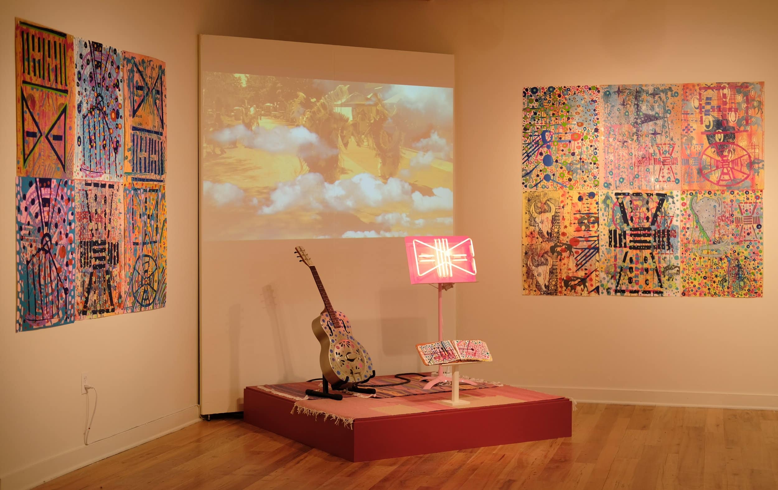 For the multisensory installation “WATER/AIR/LAND,” Hitchcock, Torres, and Mendoza came together to show the relationship of the community to the land. Because natural elements are important to Indigenous cultures, this altar of electric guitar riffs, a visual journal filled with pages of lines and color, and a bright neon sign illuminated in front of abstract imagery gives honor to the land, which is believed to be inseparable from the self. “Signage is a component of the space we live in. It colonizes the mind,” Hitchcock says. With this in mind, the video component of this piece—which flashes glimpses of endless sky and sprawling fields—can be understood as an offering of praise to the earth that holds all of us.