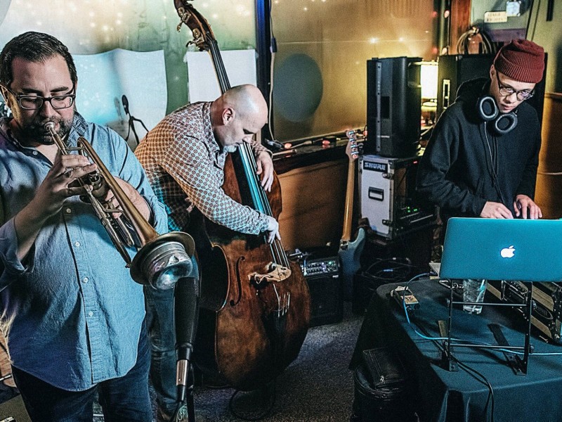 Trumpeter Jaime Breiwick, producer/DJ Ian Carroll, and bassist John Christensen began their first show as KASE with a stop-start approach, patiently threading trumpet melodies and understated rhythms through the chatter of a Saturday-night crowd at the Highbury Pub in Milwaukee’s Bay View neighborhood. Over the next hour or so, the improvisational trio built up to more aggressive beats and a more enveloping palette of acoustic and electric sounds. They built on the thumping union of Carroll’s drum samples and Christensen’s upright bass, the eerie flow of Breiwick’s sustained trumpet notes over Carroll’s nimble record-scratching, and a balance of sturdy grooves against the subtlety of ambient music.