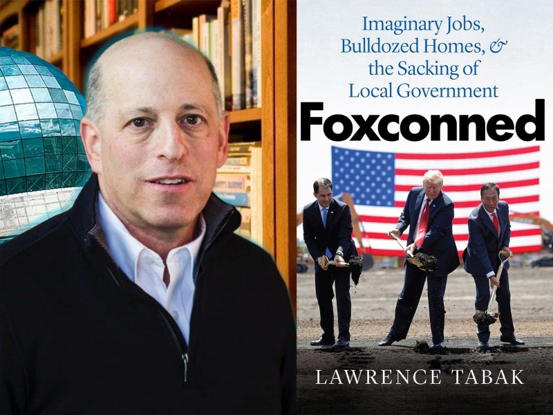 Header image: A portrait of Lawrence Tabak, along with the cover of his book “Foxconned.” The orb-shaped building from Foxconn’s Wisconsin campus is superimposed behind Tabak.