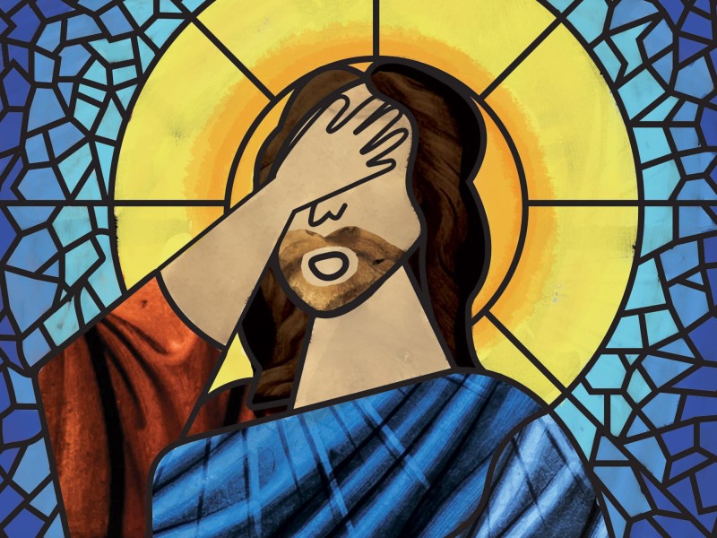 Illustration: In a stained-glass-style image, a haloed male figure with robes and a beard places his hand over his face in a gesture of exasperation. Illustration by Shaysa Sidebottom.