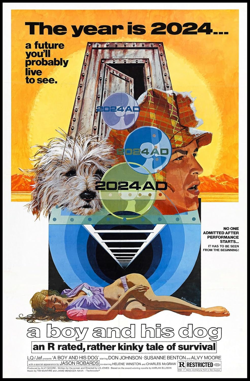 Being the adventures of a libidinous young man (Don Johnson) whose principal interests are eating food and getting laid as he roams the devastated ruins of Phoenix, Arizona, in the aftermath of World War IV with his cynical, overeducated, telepathic canine companion, L.Q. Jones’ 1975 post-apocalyptic science-fiction cult feature, A Boy And His Dog, is possibly the greatest popcorn movie ever made. Based on the award-winning 1969 novella by Harlan Ellison and set in the year 2024, A Boy And His Dog⸺billed as “an R-rated, rather kinky tale of survival”—imagines a bleak future in which sometimes literally toxic, masculine marauders compete for provisions while committing savage acts of rape and ultraviolence. An acknowledged source of inspiration for George Miller’s dystopian action film franchise Mad Max, Jones’ movie also feels like a crude, campy send-up of A Clockwork Orange (1971). Indeed, the trailer was made in the same style as the trailer for Stanley Kubrick’s film.