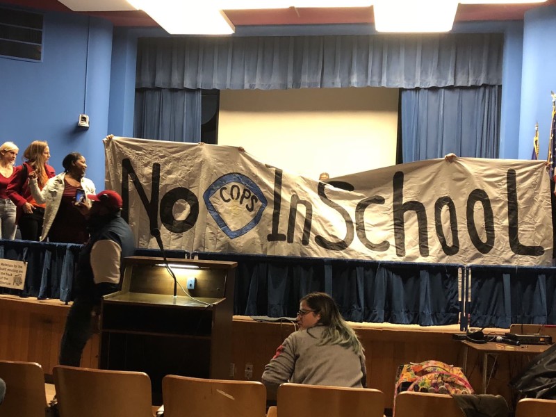 Children and parents of color, one mother speaking a language the board members could not understand for her full three-minute allowance, took turns to express their frustration with the board’s interest in keeping police officers (educational resource officers, or EROs) in Madison high schools (the board voted in December to continue this practice), painting personal depictions and sharing statistics that demonstrate how the presence of police in schools harms black and brown children and bolsters the school-to-prison pipeline. A team of young people held notebooks up in the front of the room to obfuscate Blaska’s video recordings of the brave youth who chose to speak. Yes, there was swearing and yelling. Yes, several of the protesters addressed Mary Burke with deliberate mispronunciations of her name to demonstrate how demeaning it feels when she does it to them (when they corrected her pronunciation and asked her to repeat their names, she refused in awkward silence until they moved on). Yes, the students overtook the platform with their “No Cops in Schools” banner. No, it was not scary. Half the room was filled with about 30 high school students from a geography class. Many of them clapped in support of the vocal youth. Their teacher did not usher them out for their safety. Only the board members and Blaska were visibly uncomfortable.