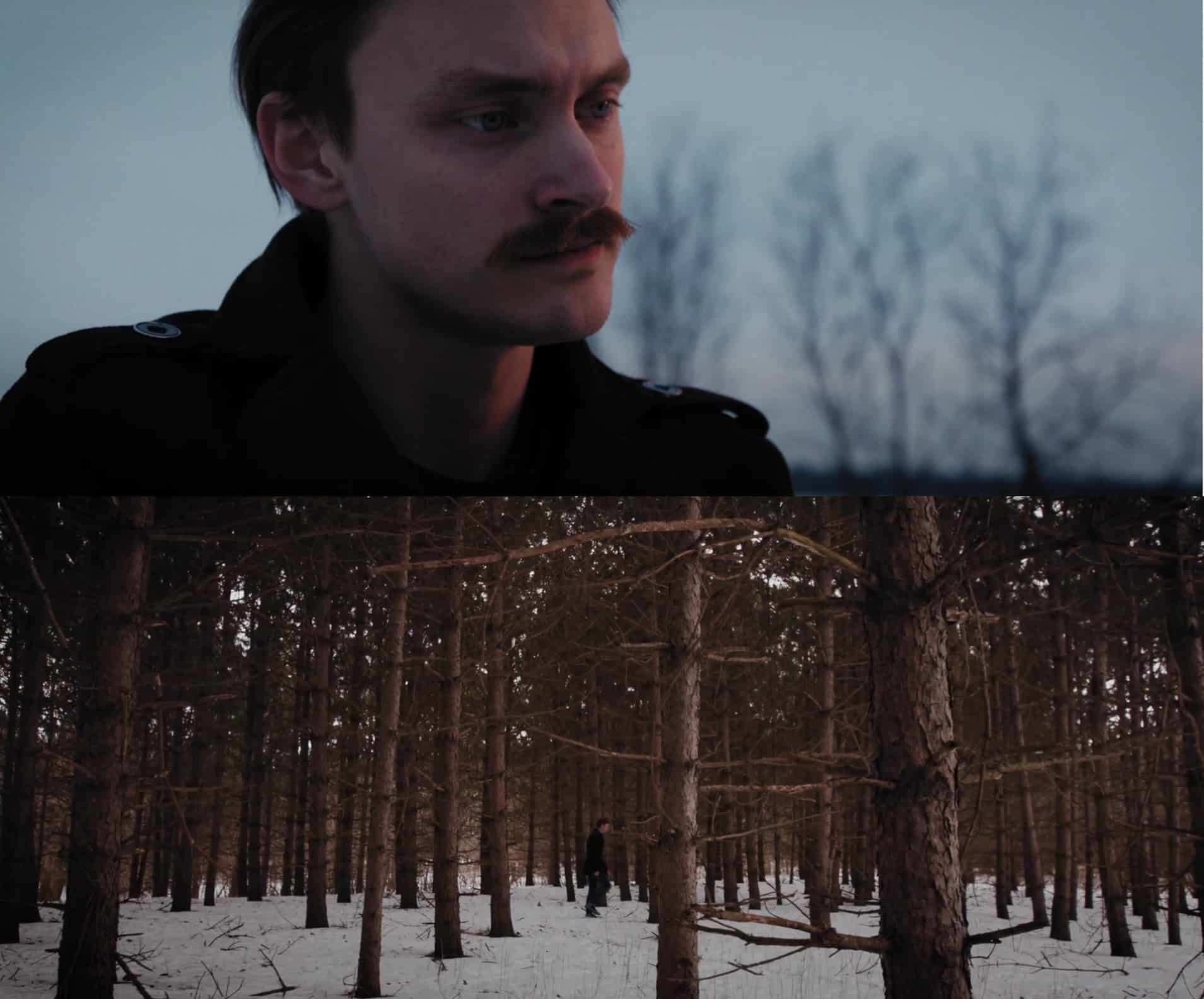 Two screenshots from the “Spark” video are shown stacked. The top image shows Michael Darling positioned to the slight left. He’s pensively staring off to the side, wearing a black coat. A pale blue sky and trees can be seen in the background to Darling’s right. The bottom image finds Darling in the middle of the screen, walking on snowy ground, a dot amongst the many tall trees.