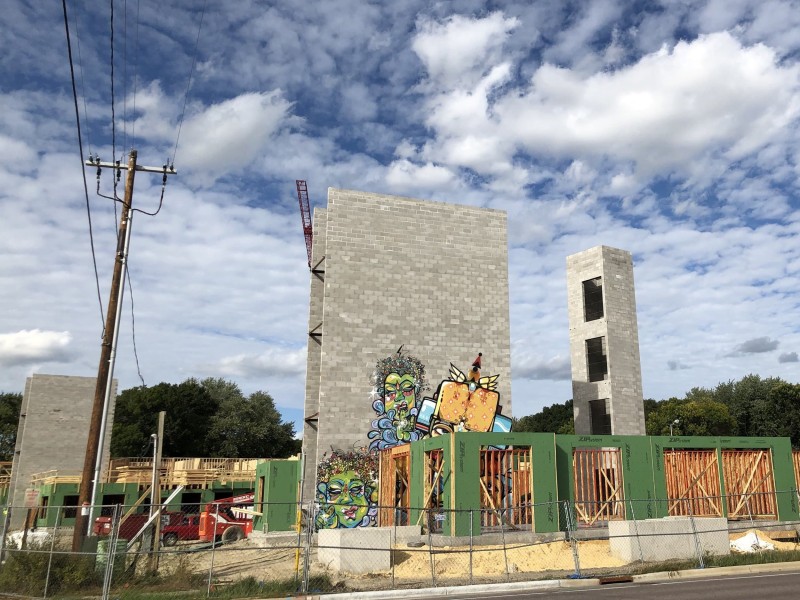 In the month since the Momentum Urban Arts Fest on the east side of Madison (mostly up and down Monona Drive), I’ve been gradually soaking up the results—street art-style murals created during the festival at 17 different spots, most of them businesses that offered up nice exterior walls. One of my favorites went up just across Cottage Grove Road from the event’s host and epicenter, Momentum Art Tech. From the graffiti-centric art shop’s doors, you can see a piece by Miami-based artist DELVS and Ras Terms (who is also from Miami, but says he’s currently on the road all the time). But this isn’t painted on a wall that will face outward for years to come. It spans about two stories on the grey shell of what will become a stairwell in an apartment complex.