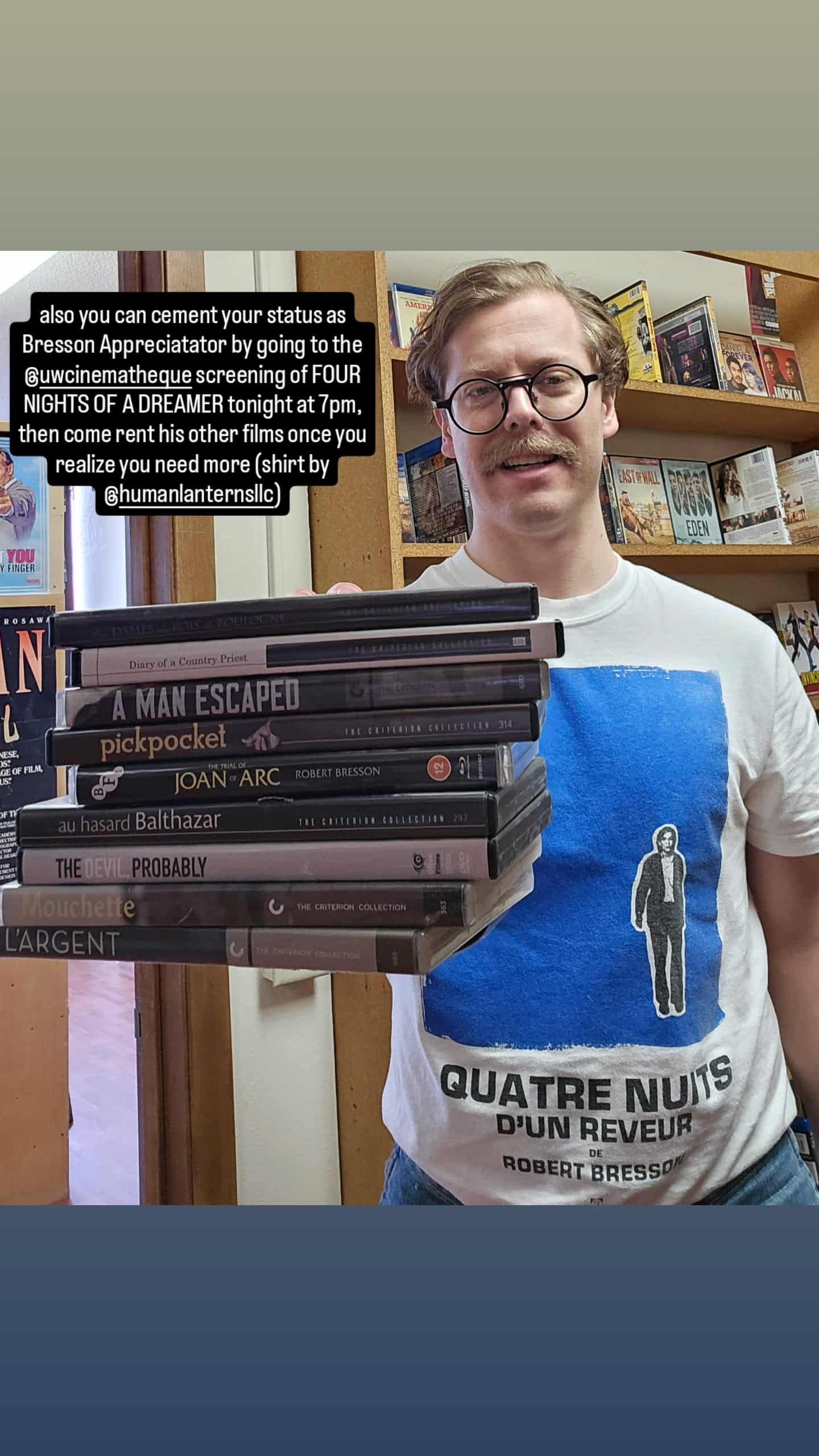 I turned to the person I know with a sizable wardrobe of movie tees here in Madison: Four Star Video Rental’s co-owner and Tone contributor, Lewis Peterson. These days he’s only behind the counter a couple times per week, but when I see him, he’s always flaunting a distinctive film-affiliated tee. (This past Monday, in a House [Hausu] hoodie, actually—not the Criterion design.) Whether that’s the Quatre Nuits D’Un Reveur de Robert Bresson tee through Human Lanterns LLC—to coincide with the November 22 screening at UW Cinematheque—or an on-set portrait of gun-slinging American cinema godfather Marty Scorsese (from andafterthat), Peterson has the hook-up. Though, it’s almost exclusively through an array of e-shops like his most endorsed Terminal Classic, Human Boy Worldwide, restricted.vr, Nervous Designs, Goodbye Press, and Scorpion Home Video / Das Bootleg.