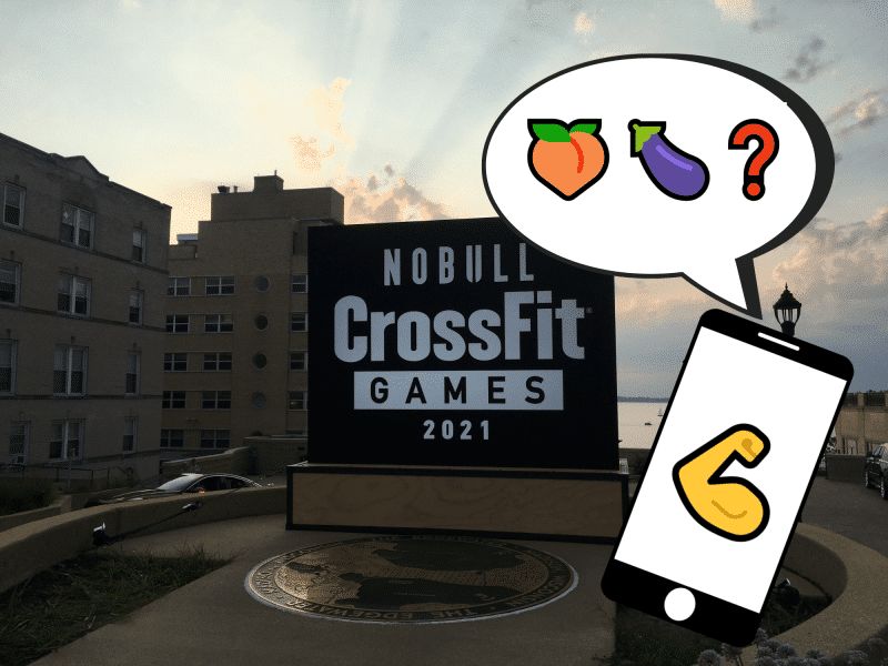 Illustration: A sign advertising this year’s NOBULL Crossfit Games in front of the Edgewater Hotel. To the right is a graphic of a phone displaying the bicep emoji, peach emoji, eggplant emoji, and a question mark.