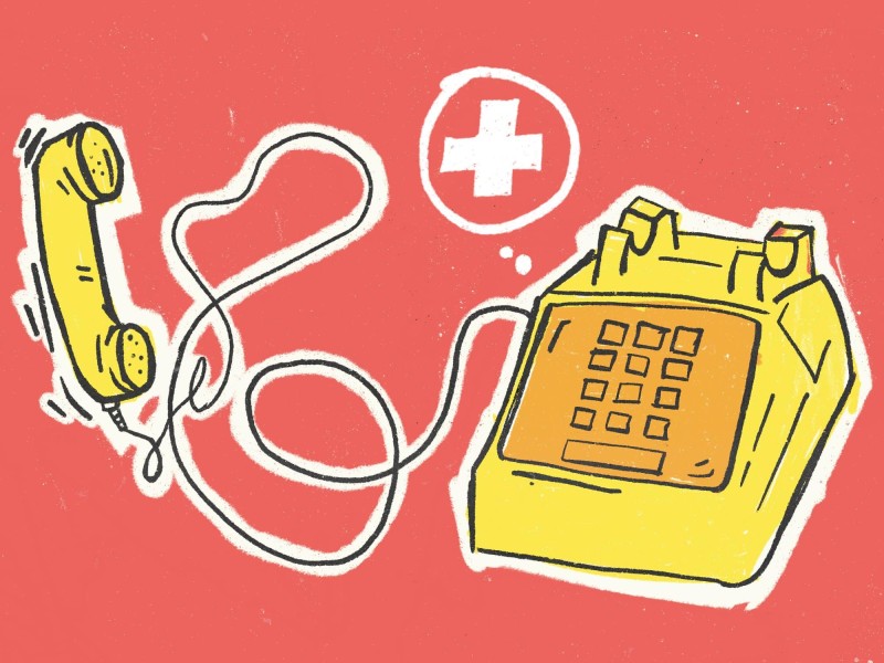 Illustration: A yellow phone is shown against a red background. A thought bubble emerges from the phone, with a medical cross symbol inside it. Illustration by American Trash.