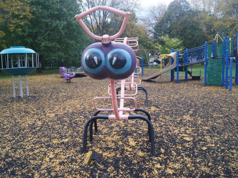 The playground inside the park is truly nostalgic. An actual working merry-go-round sits next to a swing set. Alongside this awesome amenities is an odd pair: A plastic purple dinosaur that seems to be side-eying passerby sits mere feet away from a metal, twisting, caterpillar-shaped jungle gym with eyes that stare into your soul. There’s also a sandbox.