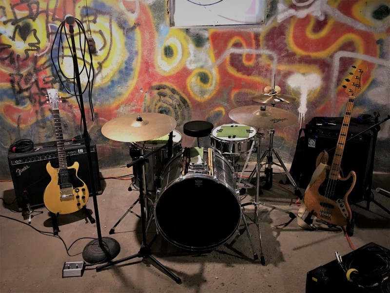 Photo: A basement studio setup is pictured. A silver Pearl Export occupies the middle space, while a TV yellow Gibson Les Paul double-cut sits on a stand to the left, in front of a Fender amp. Between those two is a microphone on a mic stand, with its cable coiled around the microphone. A footswitch for the guitar is resting near the base of the mic stand. To the left, a natural wood-finish Squire J-bass sits on a stand in front of a large Ampeg combo amp. In the lower right-hand corner the top of a PA cabinet is visible, with more coiled instrument cables resting on its surface Small mic stands holding recording mics can be seen in front of both amps and just above the bass drum. The floor is pure cement and the back wall is entirely taken up by vibrant graffiti, spare a small , cardboard-covered window opening above the drumkit. Photo by Steven Spoerl.