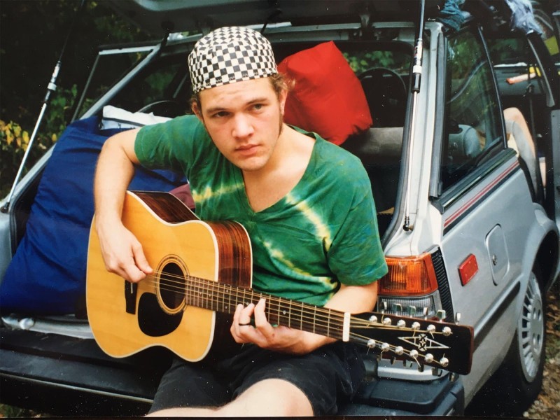 Photo: Dan Dieterich in 1991 on a trip to Lollapalooza with his brother and a group of friends. Dieterich is shown sitting in the open trunk of a hatchback-type car and playing an acoustic guitar. Photo courtesy of John Dieterich.