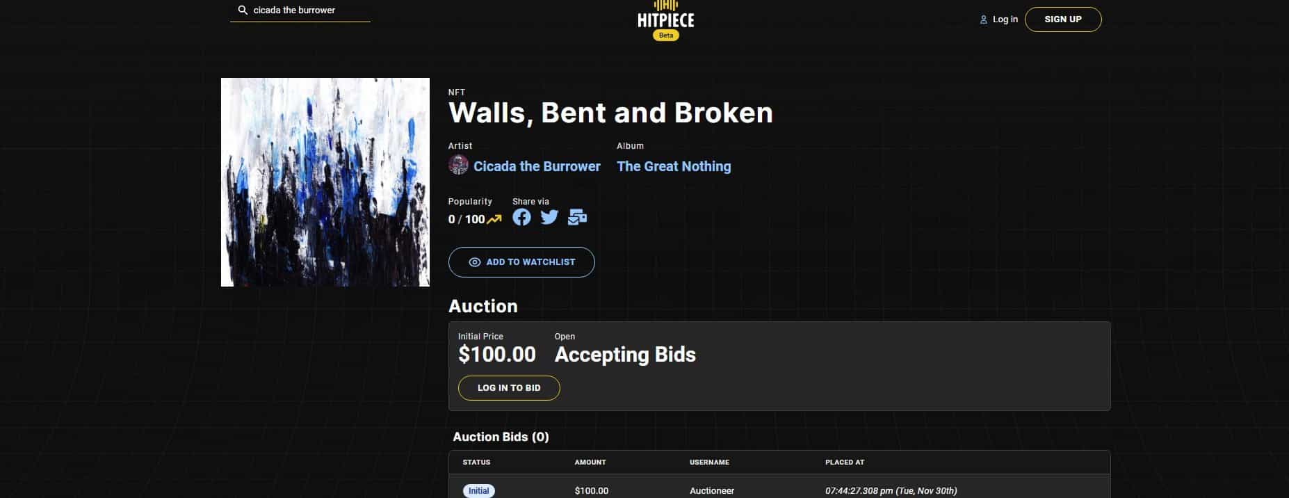 A screencap of HitPiece, in which the site displays Cicada The Burrower’s “Walls, Bent and Broken” starting at a bid of $100.