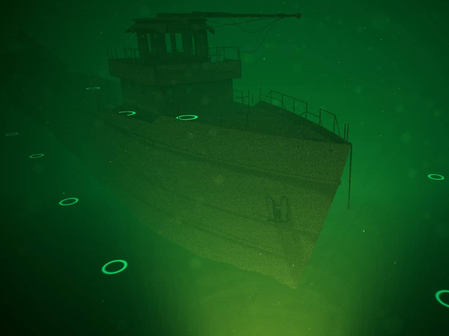 Header image: In a screenshot from the video game “The Legend Of The Lost Emerald,” a sunken ship is shown resting on the floor of Lake Michigan, viewed from the front at an angle. Several green circles around the ship indicate anchor points the player uses to navigate around the ship. Murky visibility and a greenish tint across the whole image indicate that the player is using a night-vision-like enhancement to see the ship in deep water.
