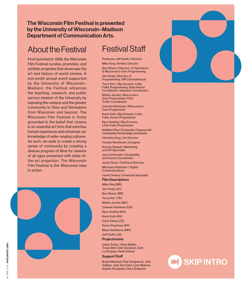 It’s that time of year again, when we try to find phrases that aren’t cliché to express the giddiness in expectantly turning the pages of the annual Wisconsin Film Festival (WFF) guide. Whether that initially happened with a paper copy on a table at Flix Brewhouse, during last week’s First Look at the Fest event, or on a screen at home—tapping/clicking to zoom in and out in a PDF viewer—it is a thrill to behold the embarrassment of cinematic riches that the programming team has been whipping up on the down-low.
