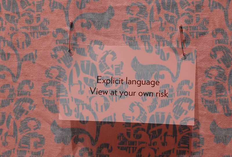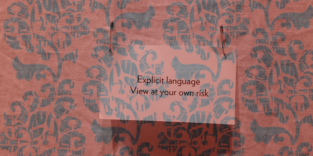 If you visit when there’s not a docent present or when Spooky Boobs isn’t hosting an event around the show, you’ll encounter something that’s not a part of the actual art: ridiculous white curtains hanging over five of the wallpaper patterns. Each has a card pinned to it reading “Explicit language. View at your own risk.” If you want to see wallpaper patterns made of the words “cunt,” “pussy,” “bull dyke,” “slut,” or “twat,” you have to pull back that work’s curtain, and I guess sort of hold it open while viewing the work from an angle, or duck your head all the way under—it’s a bit of a physically awkward viewing experience. It simply gets in the way of what is supposed to be a provocative, confrontational experience.