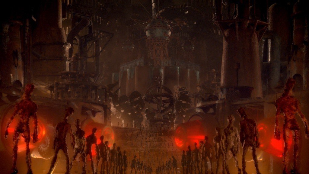 Rows of zombie workers march single-file into an infernal factory.