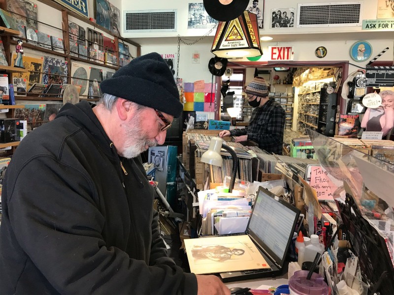 Photo: Sugar Shack Records owner Gary John Feest works the store’s counter. In the background, B-Side owner Steve Manley can be seen browsing through a crate of LPs. Photos by Andy Moore.