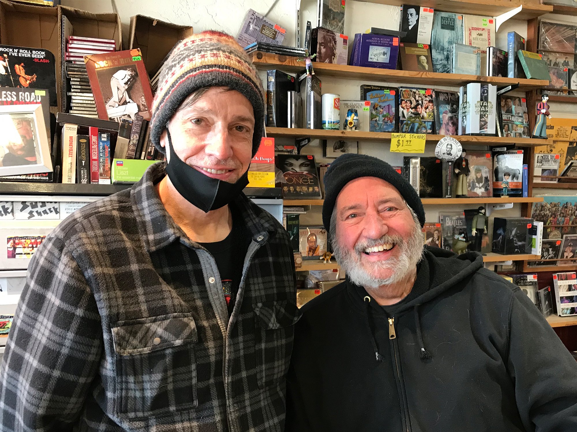 Steve Manley, left, and Gary John Feest pose together for a photo at Sugar Shack Records.