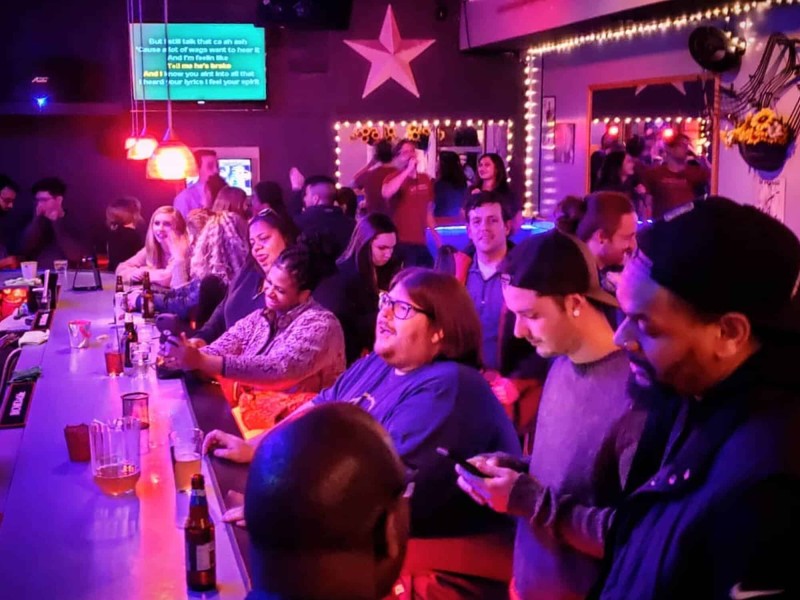 The bar itself is a decent size, stretching nearly across an entire wall of the establishment. The staff work swiftly and know what they’re doing. The whole space glows with blue and purple lights while neon writing illuminates drink specials. You’ll want to get one of those bright green drinks with the gummy worm that the woman next to you ordered, because…it’s just one of those nights! Order a jello shot or two (or five) and you’ll be on your way to karaoke ready.