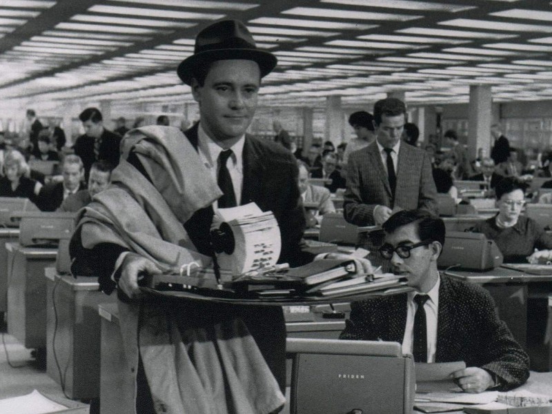 Header Image: In business attire, CC Baxter (Jack Lemmon) carries his belongings through an enormous open floor plan heading to his new executive office at Consolidated Life Insurance.