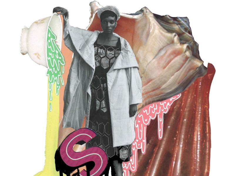The six pieces Brunswick contributed to Found capture the competing impulses of collage artists to be maximalists and to practice exacting, lean selection. “S Is For” nearly (but neatly) overpowers, using magazine-cutout components like a conch shell, a model pouring cartoonishly green liquid from a giant bowl, and a large capital “S” dripping with black paint. “L.A. Woman” is full of scribbles and scrawls—perhaps a less menacing companion to the background of “Eat Me”—and a giant inflatable lightbulb looms at the top of the piece, its crinkled texture offering a pleasing contrast with the nude figure who sits below, a bag of chips between her legs. “Future,” on the other hand, gives Brunswick’s wall of she show a restrained centerpiece, placing a resolute, posed figure in a graceful vertical sweep of black and white.