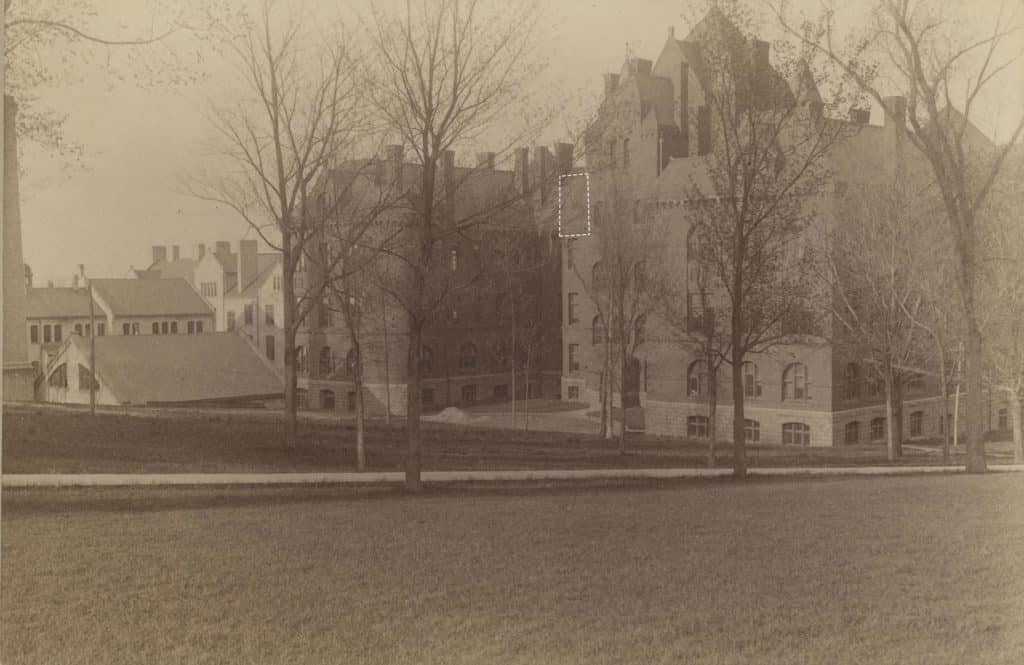 Figure 1. The dog rooms today (highlighted by the white dashed lines), from the rear parking lot of Science Hall. Photo by Howard Veregin.