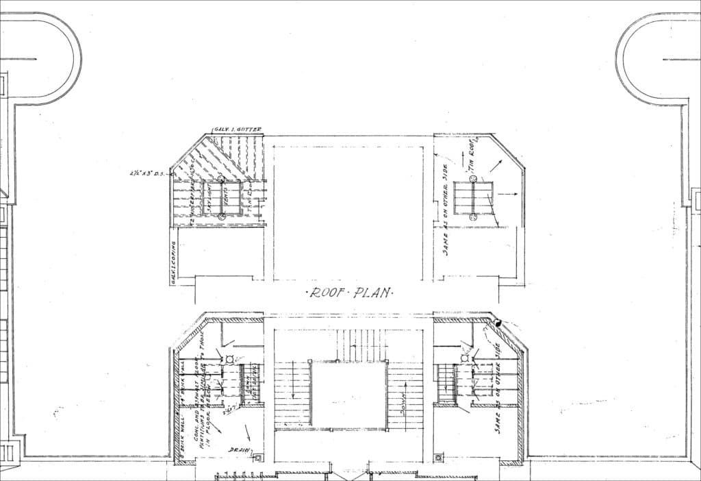 It is certain that these rooms are not original to Science Hall. An early photograph ca. 1890-99 of the rear façade of the building confirms this. (Figure 2) A later photograph—dating from the late 1920s to early 1930s—shows the two rooms after their construction. (Figure 3) This evidence agrees with several building histories stating that the rooms were added sometime before 1924. Additional evidence comes from a set of 1917 renovation plans, which depict these rooms as new additions and provide details about their construction. The plans—officially titled “Diagram for Remodelling of Science Hall, University of Wisconsin”—were produced by the Office of the State Architect in Madison in the summer of 1917.