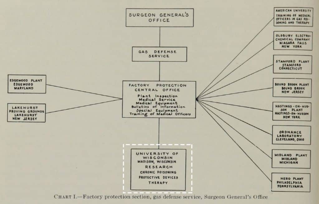 By September of 1917, students and professors at the University of Wisconsin had begun researching safety measures for workers at gas-production facilities. The University’s role in this area became more formalized in February of 1918, when the factory protection section of the Gas Defense Service was created to study the chronic effects of exposure to war gasses, and test protective devices and therapeutic treatments. (Figure 6)