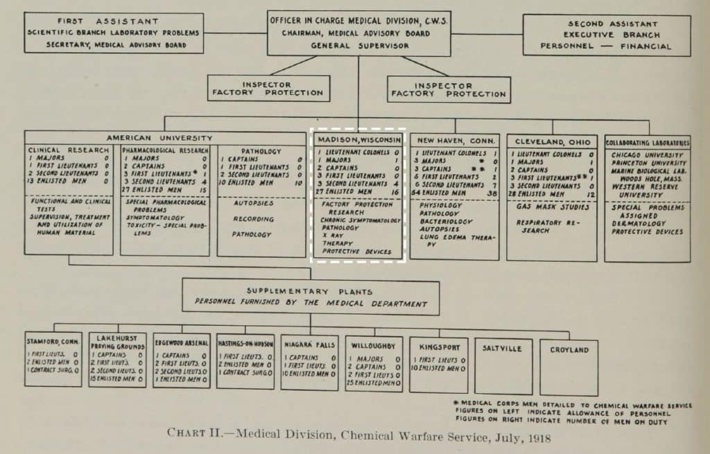 As the functions of the Gas Defense Service expanded, the Army created a new Chemical Warfare Service in the summer of 1918 to improve coordination. Under a directive of President Woodrow Wilson, the new Service absorbed the civilian research organization of the Bureau of Mines and leading researchers were given Army commissions. At this time there were almost 1,700 employees conducting chemical warfare research for the Bureau of Mines, including military and civilian personnel. According to a report by the American Chemical Society, the workforce included not just chemists and other scientists but also a “clerical force, electricians, glass blowers, engineers, mechanics, photographers and laborers.” (See page 380 of this journal.) The University of Wisconsin continued to play a central role in factory protection research including chronic symptomology, pathology, X-Ray, therapy, and protective devices, with 21 military personnel on duty. (Figure 7)