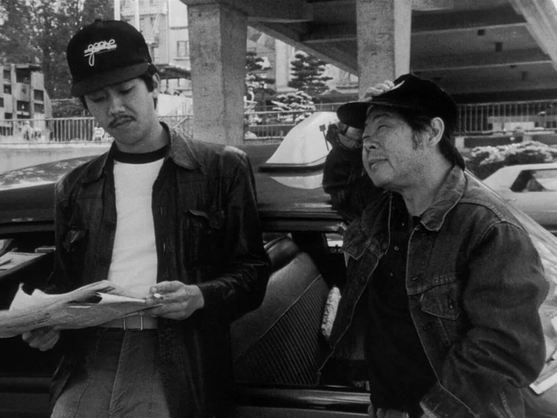 Photo: In a still from “Chan Is Missing,” Jo (right) and his nephew Steve (left) lean against a taxi cab contemplating their next move in their search for the titular Chan. Steve holds a newspaper and cigarette, trying to play it cool, while Jo seems more anxious and puzzled with his hand on his head.