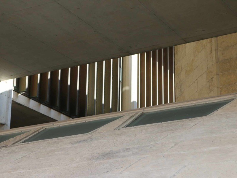 On the east side of the building, lucky students get two of these killer waffle-slab flat archways. At the center of the building, below the archway and marked with some stylish, period-appropriate street lights, the pyramidal ground level of the building opens up. It’s like walking into an anthill. This is a popular architectural flourish—compress and release—in which the view is greatly restricted at first so the release into a larger, interior space is overwhelming. The Humanities Building’s release into the courtyard is particularly relieving, given the formidable exterior. The courtyard shows strong attention to human scale. Railings, steps, benches—these things are at the size of an individual, in comparison to the gargantuan roof mass or extra-tall columns. The material shifts from unadorned concrete on the exterior to limestone blocks—softer color and smaller size, rendered in a welcoming stone. From the inside vantage point, a visitor can see that the roof mass is occupiable—windows at these levels on the interior give away what, from the outside, looked like a gargantuan, solid slab. This kind of insider knowledge and attention to human scale, available only to the visitor who comes inside, is what makes this architecture so exciting.
