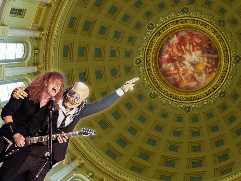 Image: Wisconsin State Capitol dome photo via Phil Roeder on Flickr, image of Dave Mustaine and Megadeth mascot via Wikimedia Commons.