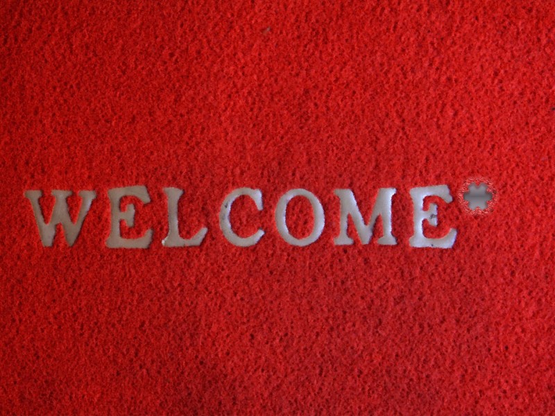 Illustration: A red, shaggy door mat with the word “welcome” printed on it in grey capitalized text, and an asterisk at the end of the word. Source image via pxhere.