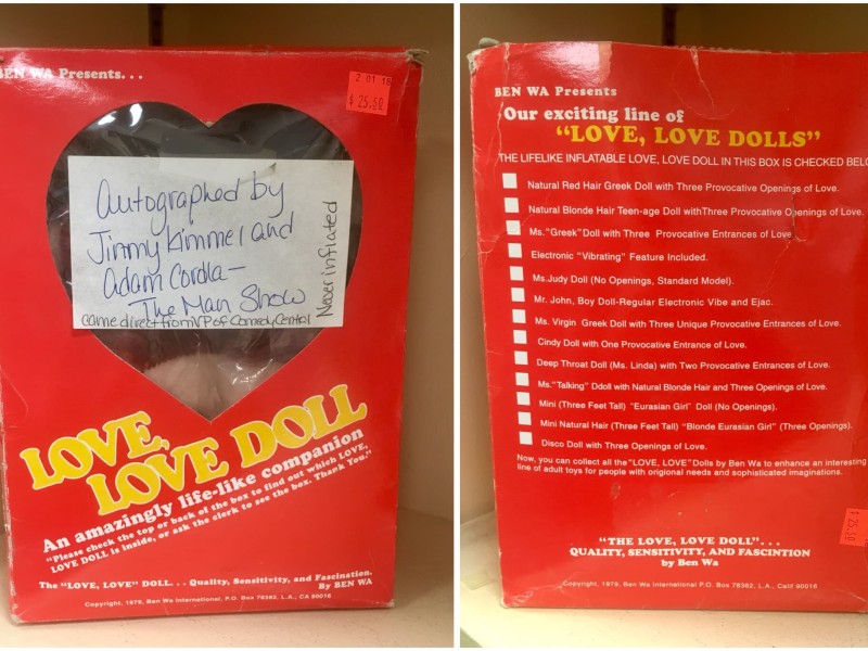 Tucked away behind lock and key alongside “adult” books including The Joy Of Sex and illustrated variations on Kama Sutra, I spotted a bright red box labeled “Love, Love Doll.” That would be enough on its own, but this gets weirder than just a mundane secondhand sex toy. Taped to the front of the box was a handwritten card (in two different colors of ink) that reads “Autographed by Jimmy Kimmel and Adam Carolla – The Man Show … Came direct from VP of Comedy Central … Never inflated.”